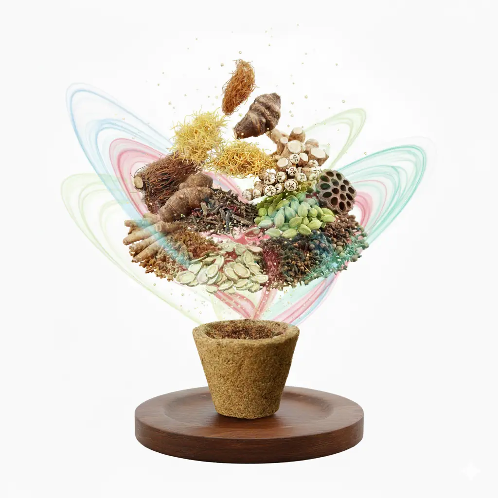 Jatamasi, Nagkesar, Satavari, Nagarmotha, Agar, Tagar, lotus seeds, elachi, cloves to ignite positive energy and balance in life.